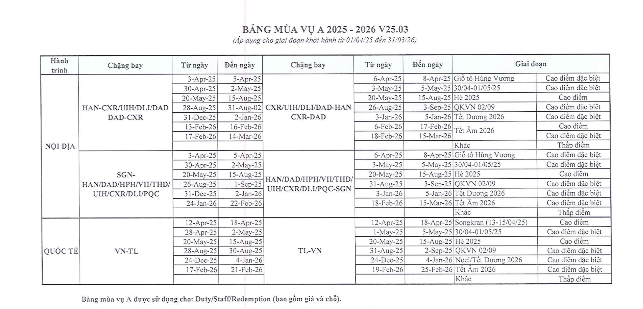 Mùa cao điểm bay quốc nội và quốc tế xem TẠI ĐÂY.
